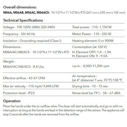 Ideal for hospitality properties, retail spaces, office buildings, and commercial facilities, the M06AC combines corrosion-resistant construction with reliable high-speed drying.